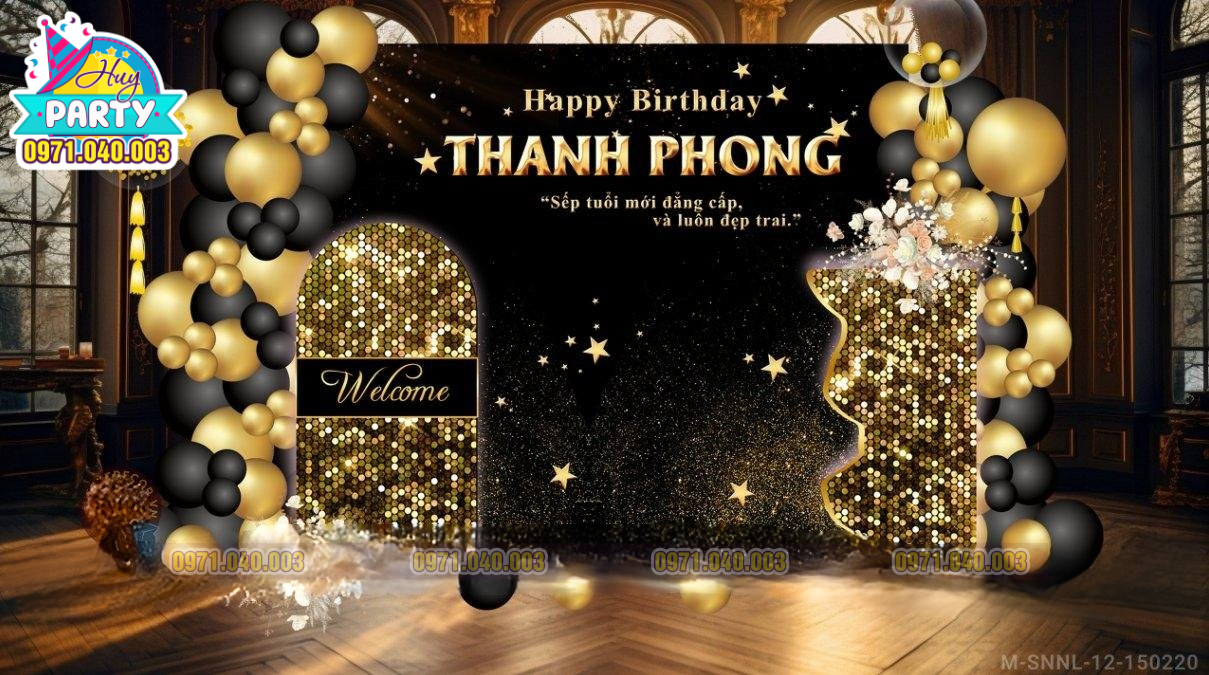 Phong cách tone đen – vàng – bạc, sử dụng bóng bay cao cấp và backdrop thiết kế riêng giúp bữa tiệc trở nên đẳng cấp.